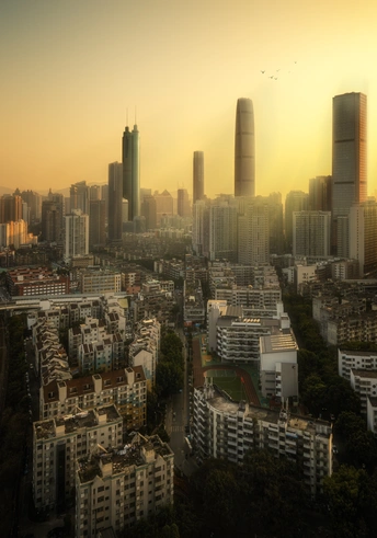 日落时分的罗湖天际线,夕阳如同圣光照耀众生,像是在宣告黑夜即将到来。