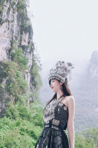 春风掠过青山,绿意如诗蔓延。身着苗族服饰的女孩静立其间,繁复精美的银饰与刺绣,在阳光下流转着绚丽色彩。她低头沉思的模样,似在聆听春的私语,又似在编织新岁的憧憬。春景与民族风情交织,定格下生机与思索碰撞的刹那,诉说着岁月静好与春日的无限遐想。