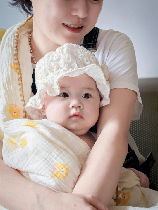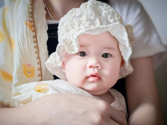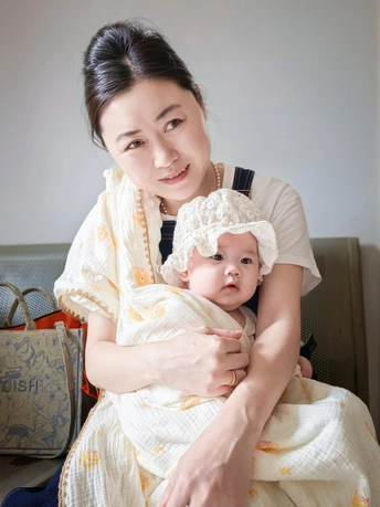 医院的走廊处,椅子做一位怀抱bb的妈妈,宝贝一会啃手指,一会又对周边的环境很好奇的样子,特别呆萌可爱。