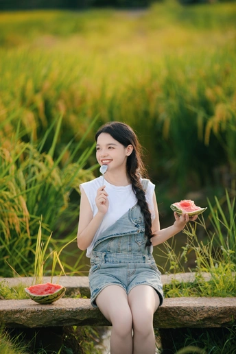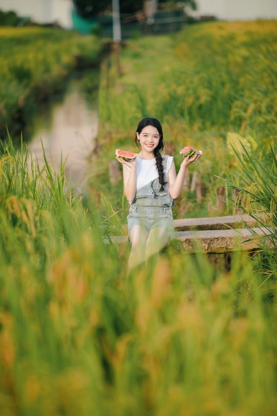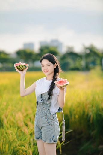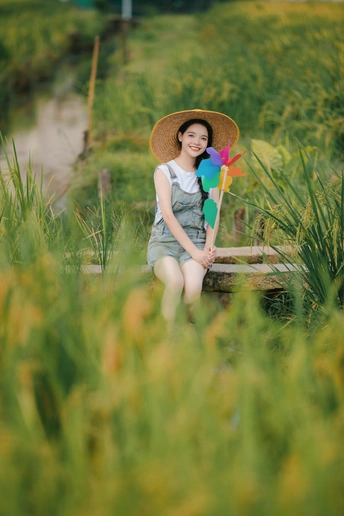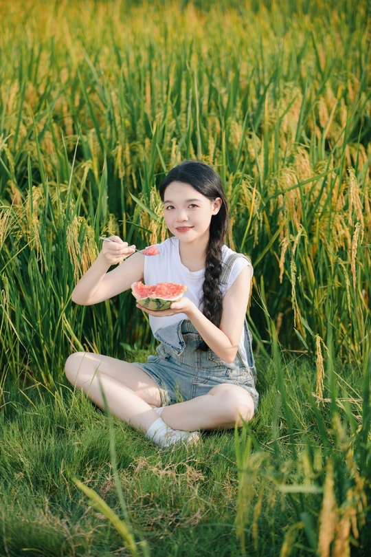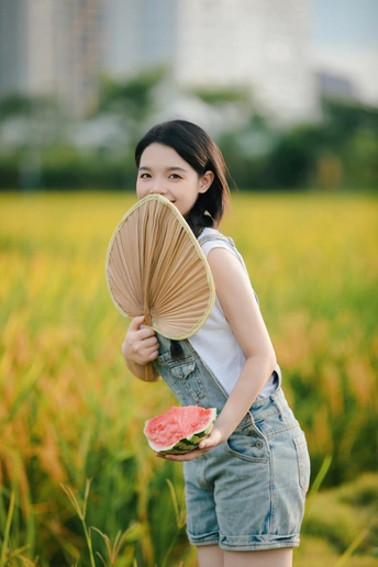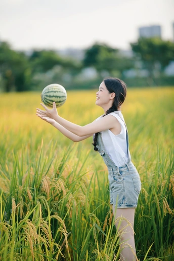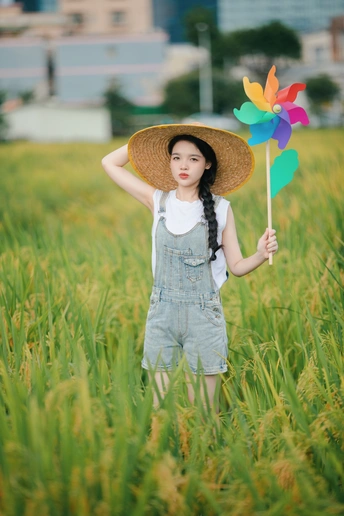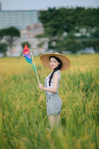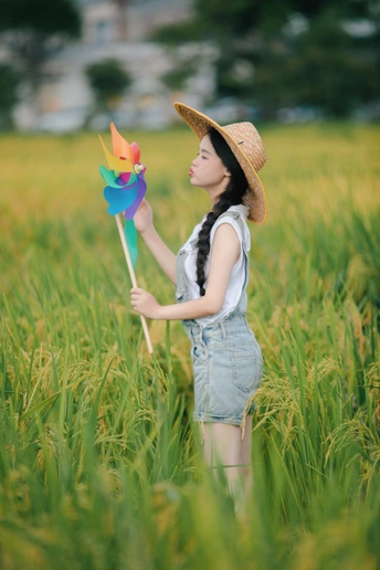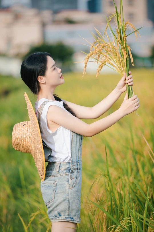 在希望的田野上,风拂稻浪。她背着草帽,双手捧起成熟的稻穗,眸光里满是对丰收的期许。那金黄的稻穗,是大地的馈赠,亦是汗水凝铸的勋章。于这方天地间,她与自然相拥,续写着岁月里质朴又动人的农耕诗章。