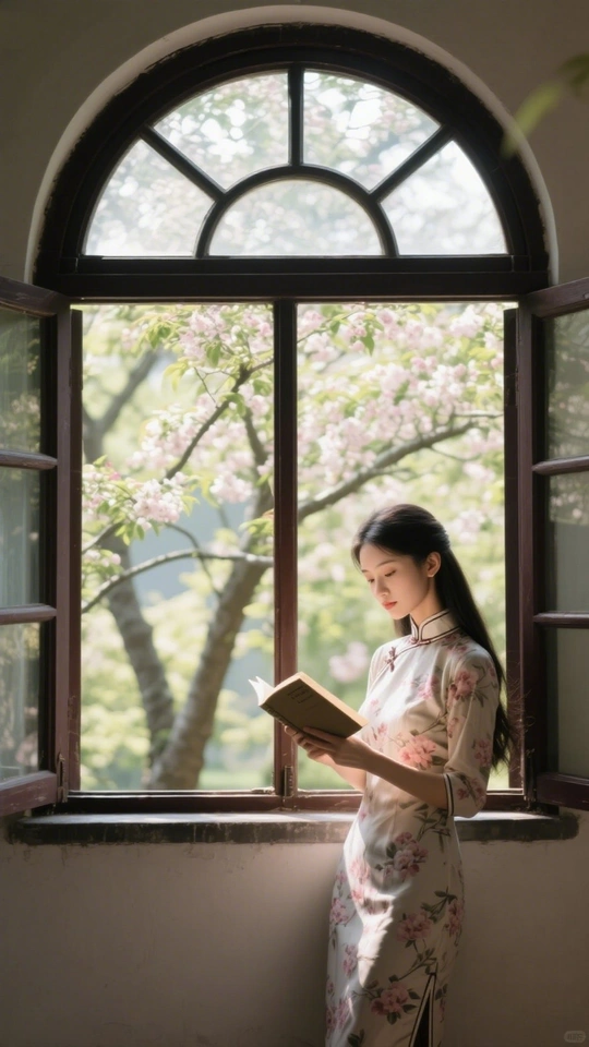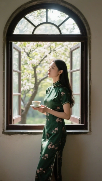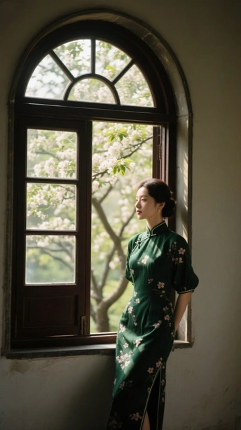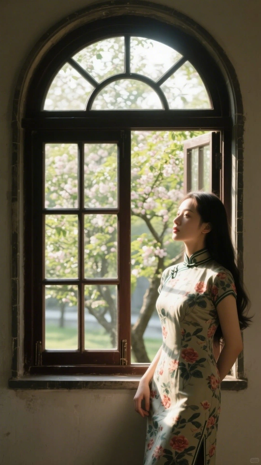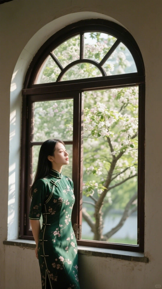 构图巧妙,女子于窗前站立,成为画面视觉中心,窗框似天然画框,增添层次感。色彩搭配雅致,墨绿色旗袍上的花纹与窗外粉白花朵、翠绿枝叶相互映衬,营造出古典氛围。光影运用细腻,阳光透过窗户,洒在女子身上,柔和且富有质感,凸显温婉气质。主题借女子凭窗望向春日繁花之景,传递出一种悠然、恬静的意境,满是东方韵味。 色彩:绿色旗袍与背景的白色花朵形成对比,主色调和谐统一,营造出一种清新淡雅的氛围。 光影:光线柔和,从窗外洒入,照亮了人物的侧脸,营造出一种唯美的感觉。 构图:人物位于画面中心,视线朝向窗外,引导观者看向远方。窗户的几何形状也增加了画面的趣味性。 后期处理:后期处理恰到好处,没有过度修饰,保留了照片的自然感。 主题原创性:照片主题明确,表现了女性的柔美和对美好事物的向往。虽然主题本身并不新颖,但通过旗袍、窗户等元素的运用,营造出了一种独特的意境。 情感共鸣:照片能够引起观者的共鸣,让人感受到一种宁静和美好。人物的表情自然,眼神中充满了希望,很容易让人产生情感上的共鸣。 思想深度:照片传达了一种对传统文化和美好生活的向往。虽然没有深刻的思想内涵,但能够引发人们对生活、对美的思考。