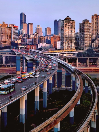 在这座充满魅力的山城,轻轨与纵横的高架桥相映成趣。轻轨穿梭于林立高楼间,如灵动的丝带,不仅高效串联起城市各处,更让人们的出行变得便捷从容,极大缓解了交通压力,提升了城市运转效率。滚滚车流彰显着城市的蓬勃生机,而轻轨则以绿色、高效的姿态,成为缓解拥堵、倡导低碳出行的有力践行者。它跨越山川、连接城乡,打破地理阻隔,让城市资源分配更趋均衡,为经济发展注入新动力,助力区域协同共进。这独特的景象,不仅是城市交通的立体画卷,更象征着城市在现代化进程中,对便捷、高效、绿色生活的不懈追求,见证着城市发展为人们带来实实在在的福祉,成为社会进步与繁荣的生动注脚。