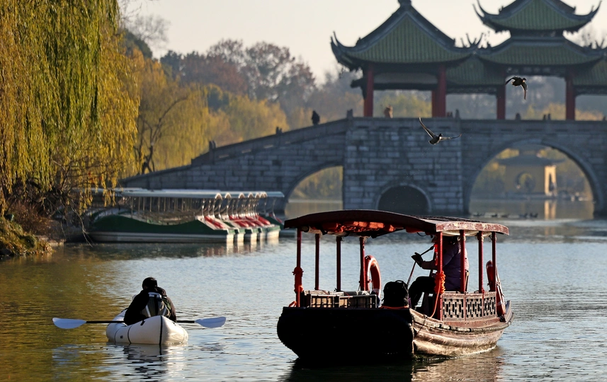 深冬之晨,皮划艇爱好者泛舟湖上。 一旁,姑娘手摇着船去码头上班, 两只野鸭略过湖面。 同一个时空 不同的状态。
