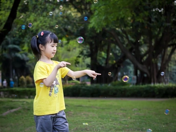 “阳光、草地,还有飞舞的泡泡。小女孩的小世界,藏着大快乐。