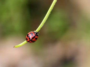 看,瓢虫先生身着红黑相间的“时尚外衣”,悠然趴在绿茎上,静静诉说着大自然的静谧故事。粉花轻绽,似少女羞涩的笑靥,阳光倾洒,每片花瓣都闪烁着温柔的光。草叶间的露珠如水晶般剔透,藏着整个清晨的清新与宁静。