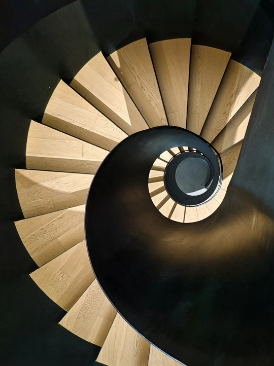 武汉美术馆琴台馆的旋转楼梯,木色与黑色对比鲜明,简洁又富有张力
