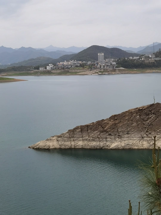其实是一个大湖的一角,天空有点阴霾,远处的山峦和小城在一片氤氲之中,静谧里时光荏苒。