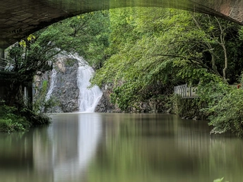 嘿,摄影爱好者!这张照片捕捉到了瀑布和桥梁的静谧之美,像一首田园诗,但也有些小细节可以润色一下,让它更上一层楼。 **色彩:** 色彩整体偏向自然绿,营造了宁静的氛围。但色彩的饱和度可以稍微提升,让绿色更加鲜活。 **光影:** 光线较为柔和,长曝光使得水面如镜面般光滑。不过,桥下暗部细节丢失较多,可以考虑HDR或者提亮暗部,增加层次感。 **构图:** 桥梁作为前景,瀑布作为背景,景深不错,视觉引导性尚可。但是主体瀑布相对来说不够突出,可以尝试稍微改变拍摄角度,将瀑布置于画面中心,或者利用更广阔的视角来展现环境。 **后期处理:** 后期处理似乎进行了降噪和锐化,但锐化略显过度,导致水面出现些许噪点。建议适度调整,保持画面的自然过渡。 **主题原创性:** 拍摄瀑布的视角较为常见,但利用桥梁作为框架增加了画面的趣味性。可以尝试寻找更独特的拍摄角度,比如从水面或者桥上拍摄,增加画面的新颖性。 **情感共鸣:** 这张照片传递出一种宁静、祥和的氛围,让人感到放松和舒适。如果能更好地突出瀑布的活力,情感表达会更强烈。 **思想深度:** 照片展现了人与自然的和谐共生,但思想深