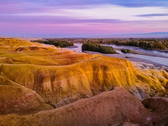 这张照片展示了布尔津五彩滩一片壮丽的地貌景观,前景是连绵起伏的土黄色丘陵,表面有着明显的侵蚀痕迹。远处是一条蜿蜒流淌的河流,河岸两侧长满了树木和灌木丛。天空呈现出渐变的颜色,从淡紫色到粉红色再到蓝色,给人一种宁静而神秘的感觉。