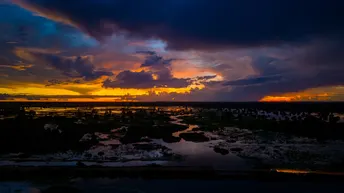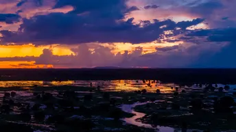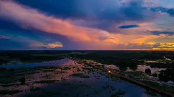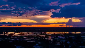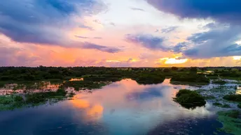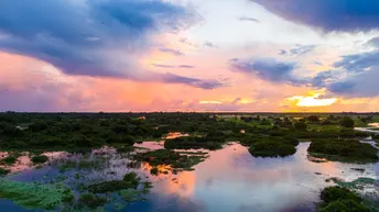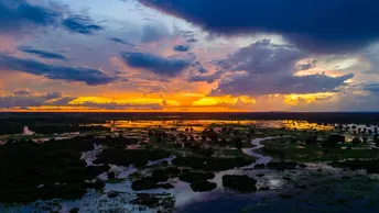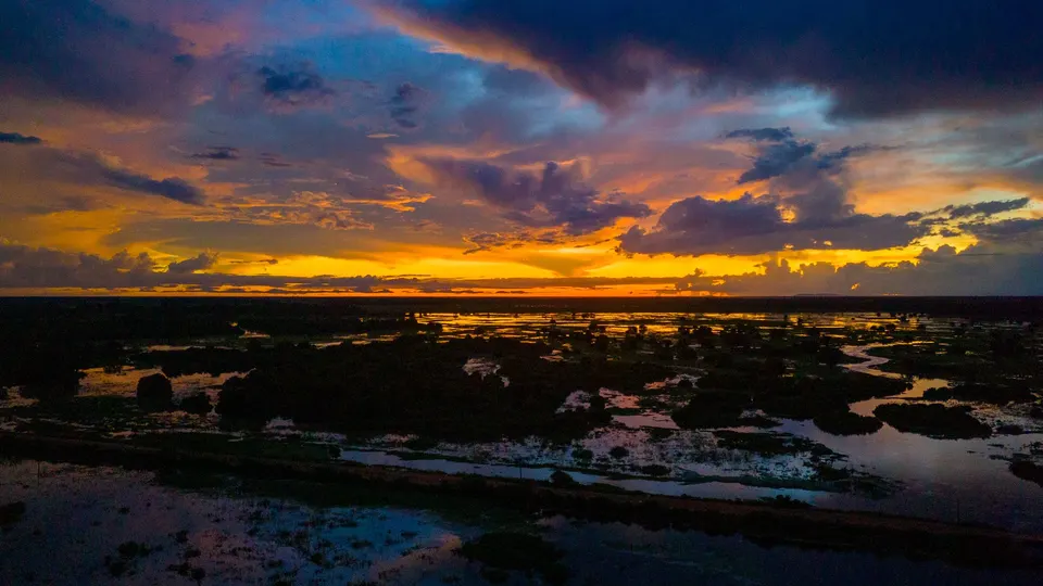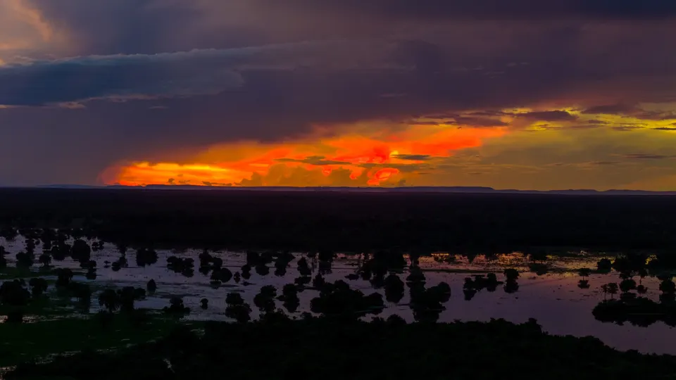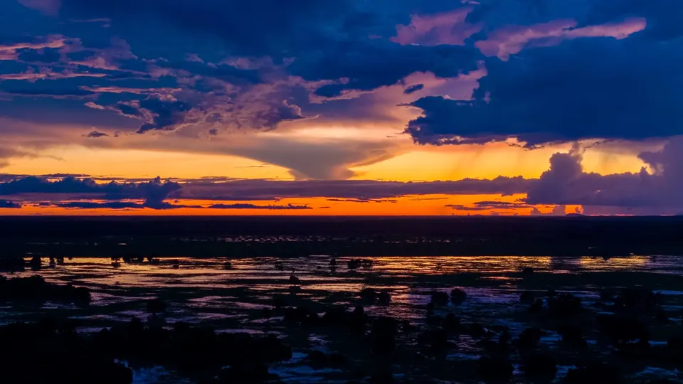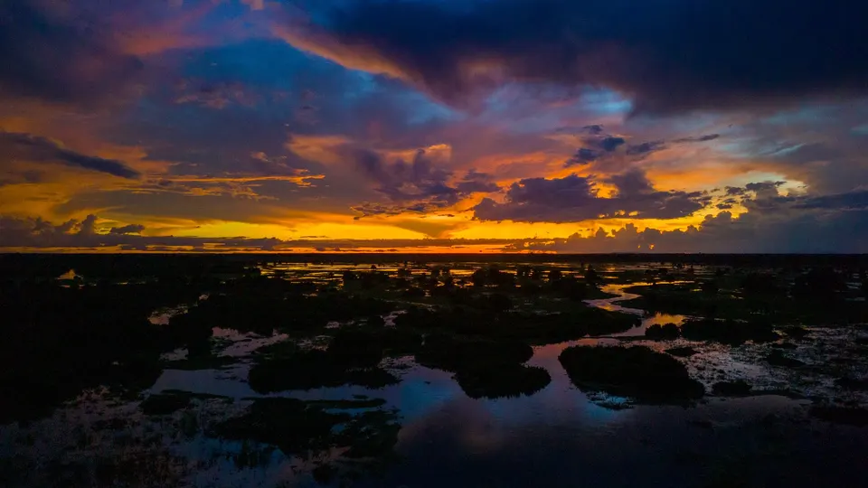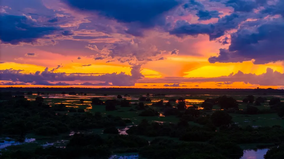 潘塔纳尔湿地(Pantanal)是巴西乃至全球最大的热带湿地,位于马托格罗索州和南马托格罗索州,靠近玻利维亚和巴拉圭边境。落日时分的潘塔纳尔湿地景色壮丽,橙红色的天空倒映在平静的水面上,与广袤的沼泽、河流和丰富的野生动植物交相辉映,营造出一种宁静而震撼的自然美景。
