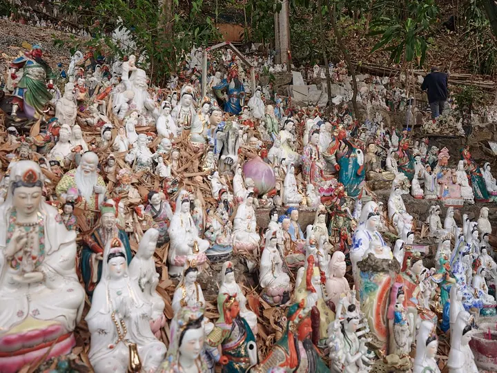 更换信仰的人们把旧神们放到这里。从家里的神成为山野的弃物,无人再供奉便也同凡人一样经历风雨,倒颇有抱团取暖的意思。