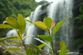 流动的水——无形,却海纳百川, 平静拥有汹涌澎湃的力量; 石缝中的叶子——小个头却根深蒂固, 体现出它对生命的渴望; 水和叶子展示出无穷的生命力!