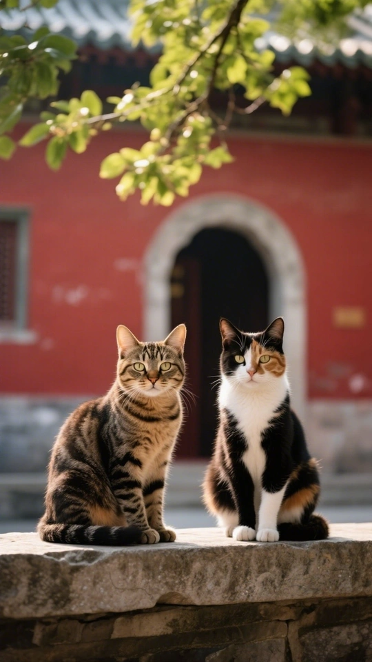 在红墙古寺的光影里 两只猫 坐着 像古老禅意的句点 狸花的纹路 藏着 山林的密语 岁月的诗笺 三花的眼眸 映着 晨钟的余韵 暮鼓的轻眠 此时,它们安静地 等着斋饭梆板声响起 色彩:照片整体色彩和谐,红色的背景墙与猫咪的毛色形成对比。 光影:光线柔和,猫咪脸部细节清晰,但光线稍显平均,缺乏立体感。建议尝试在不同时段拍摄,捕捉更有戏剧性的光影效果。 构图:构图比较规整,猫咪占据了画面中心位置,但略显呆板。可以尝试运用三分法,将猫咪放置在画面的黄金分割点附近,会更有活力。 主题原创性:照片主题明确,表达了猫咪与古建筑的和谐共生,但缺乏新颖的视角。 情感共鸣:照片展现了猫咪的可爱和宁静,容易引起爱猫人士的共鸣,但情感表达稍显平淡。