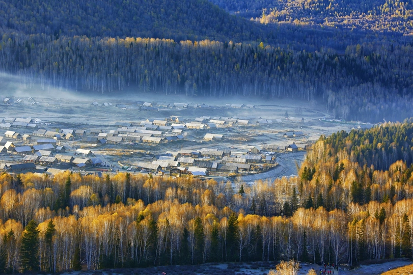 这张照片展示了新疆阿勒泰地区禾木村宁静的乡村景象,村庄被一片金黄色的树林环绕,远处是连绵起伏的山脉。晨雾笼罩着整个山谷,给人一种神秘而祥和的感觉。