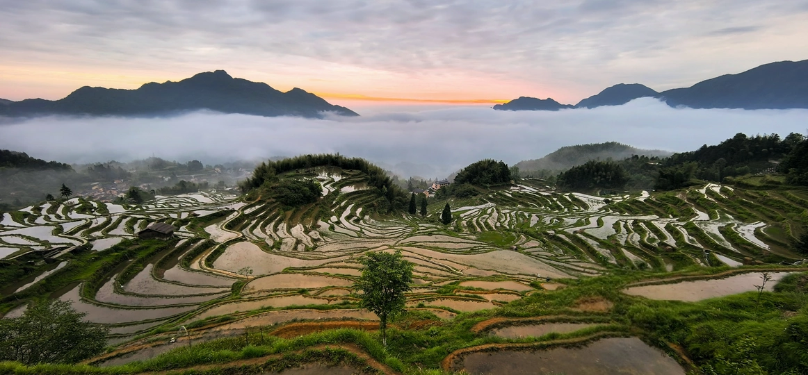 晨曦微露,梯田在山间苏醒。层层水田如镜面,倒映着天光云影。薄雾似轻纱,缠绕于山峦之间,如梦如幻。这是大自然勾勒的诗画长卷,让人沉醉在这方宁静而美好的田园天地。