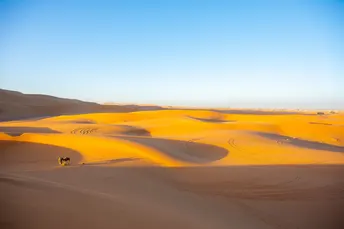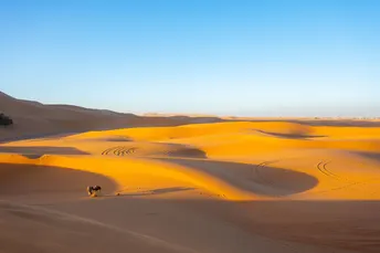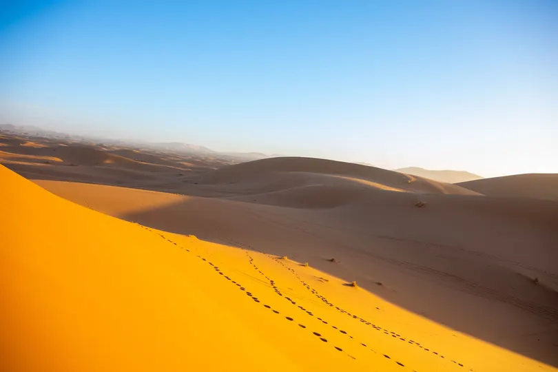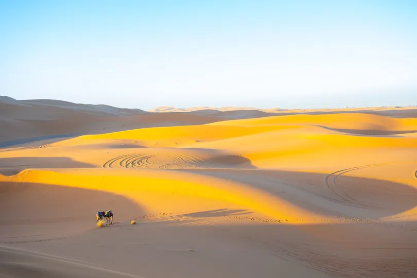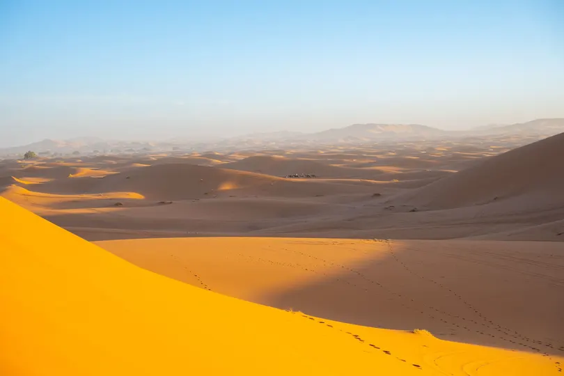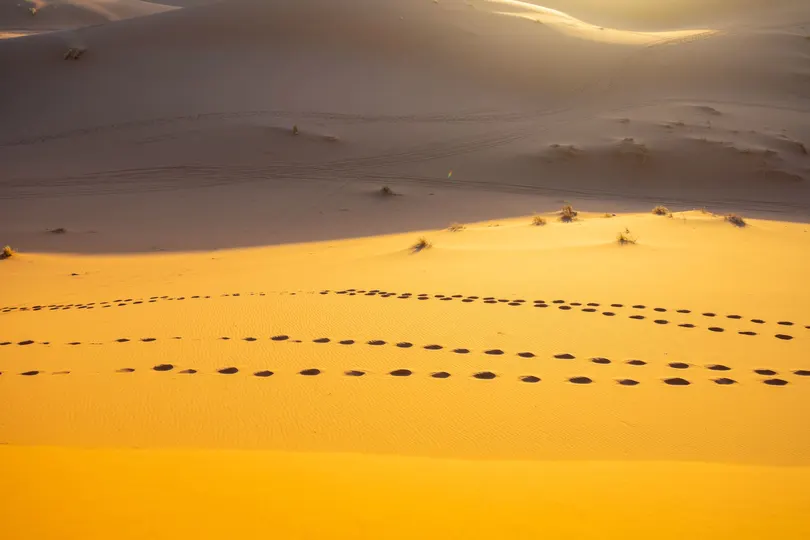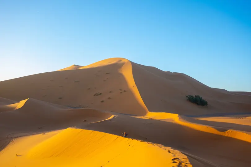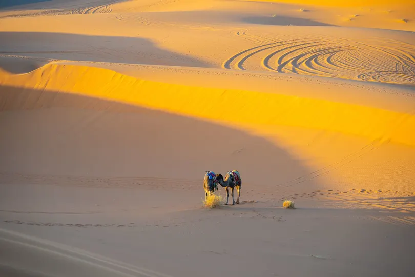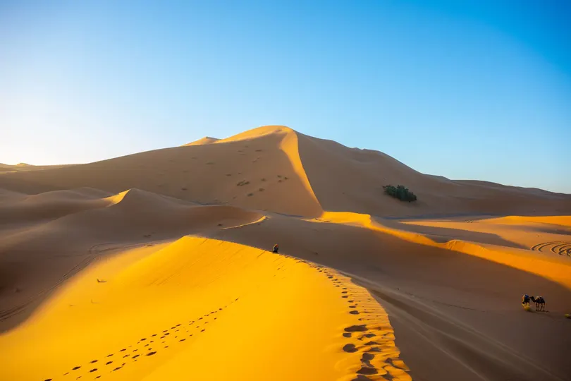 摩洛哥撒哈拉沙漠的日出,尤其是金色的日出景观,是许多旅行者梦寐以求的体验,特别是在梅尔祖卡(Merzouga)附近的Erg Chebbi沙丘。这里是摩洛哥最著名的撒哈拉沙漠景点之一,以其壮观的沙丘和令人叹为观止的日出而闻名。 在Erg Chebbi沙丘,太阳从地平线升起时,沙丘被染成金色、橙色和粉红色的渐变色调,沙丘的曲线和纹理在晨光中显得格外柔美。这种“金日出”是大自然的杰作,尤其在清晨空气清新时,景色更加震撼。