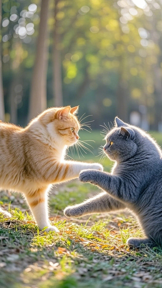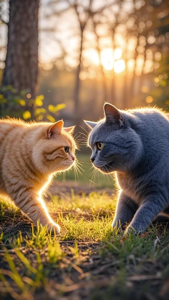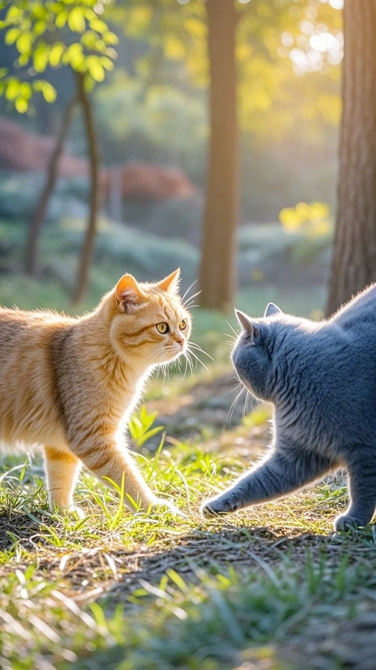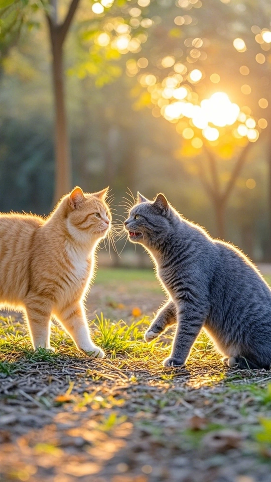 夕阳为草地镀上金芒, 一场“战事”,在这里开唱。 橘猫威风凛凛,毛发微微炸起, 灰猫不甘示弱,身姿蓄势待发。 眼神如箭,似在较量, 灰猫前爪抬起,似要发动攻击, 橘猫脚步轻挪,准备巧妙抵挡。 周围光影斑驳,在为它们紧张, 在夕阳下,谱一曲猫猫的狂想。 色彩:橙色和灰色猫咪的色彩对比很醒目,加上暖色调的阳光,让画面充满活力。 光影:逆光的使用非常聪明,给猫咪镶上了金边,营造出梦幻般的效果。 构图:主体猫咪位于画面中央,引导视线集中。可以尝试使用三分法,将猫咪放在画面的一侧,也许会带来更动态的视觉效果。 后期处理:后期处理整体自然,没有过度修饰的痕迹。可以稍微调整对比度和饱和度,让画面更有层次感。 主题原创性:照片展现了猫咪之间的互动,主题鲜明有趣。 情感共鸣:猫咪剑拔弩张的状态引发了人们的好奇心,很能引起情感共鸣。照片充满趣味性,让人忍不住想知道发生了什么。 思想深度:虽然照片主要展现的是猫咪的互动,但也可以引发我们对动物行为和社交的思考。 总的来说,这张照片很棒!如果能在构图和色彩方面稍加改进,相信会更加出色。继续加油,期待你更多精彩的作品!