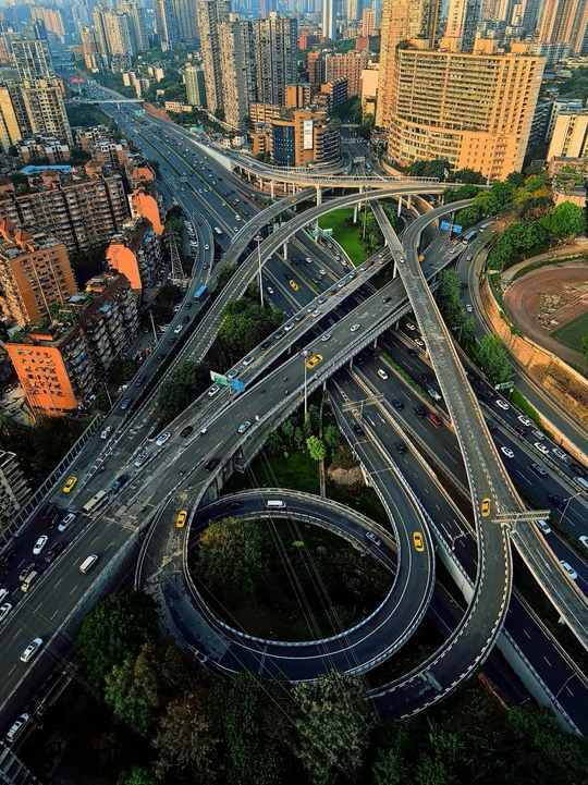 在城市的核心脉络处,一座庞大的立交桥如钢铁巨龙般盘踞。纵横交错的匝道,似复杂却有序的神经,编织出城市交通的网络。车辆如灵动的音符,在这钢铁琴弦上穿梭跳跃,奏响一曲现代都市的奋进乐章。 高楼大厦如沉默的卫士,环伺四周,见证着这座城市交通枢纽的繁忙与活力。立交桥不仅是交通的连接点,更是城市发展的象征,承载着人们的出行梦想,也托举着城市不断向前的希望。每一次车辆的交汇与分离,都是城市节奏的一次呼吸,在日升月落间,永不停歇。