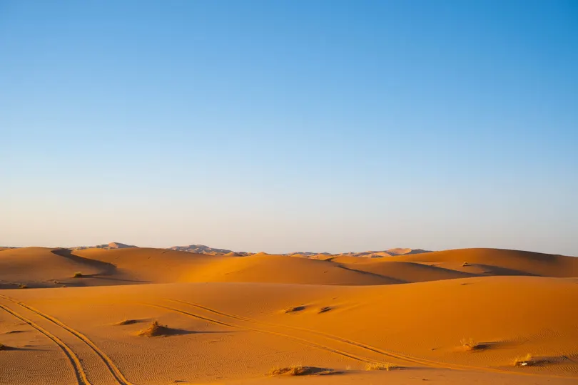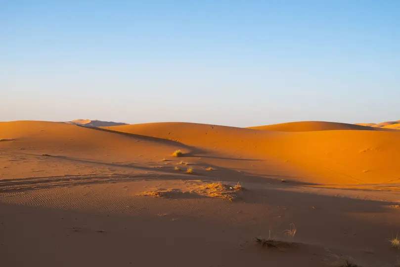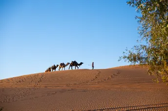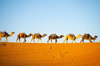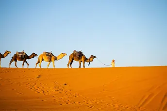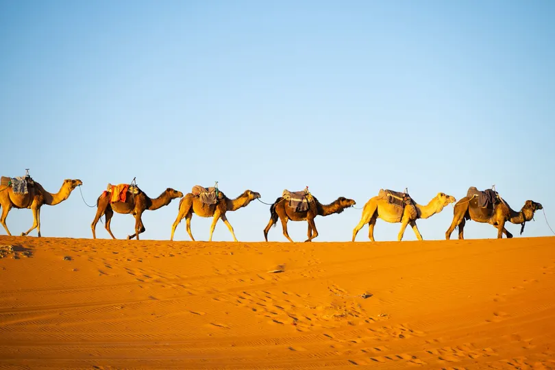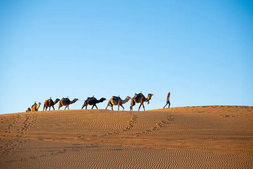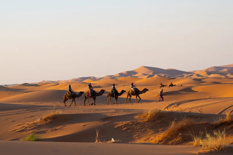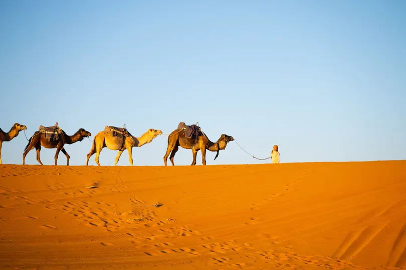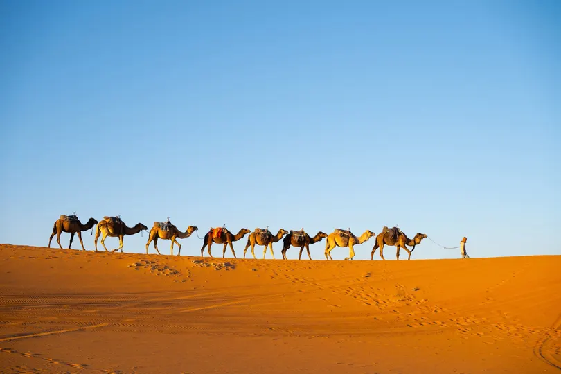 摩洛哥撒哈拉沙漠的驼队是探索这片壮丽沙漠的标志性体验,尤其在梅尔祖加(Merzouga)附近的埃尔格舍比(Erg Chebbi)沙丘一带。 骑着单峰骆驼穿越金色沙丘,欣赏日出日落,夜晚在贝都因风格的沙漠营地住宿,享受篝火、传统塔吉锅餐和星空