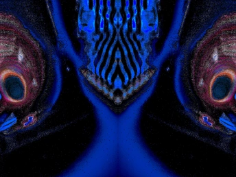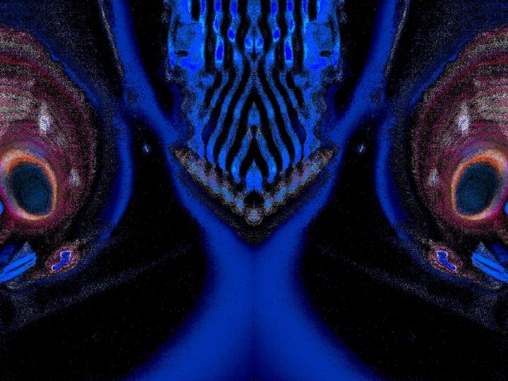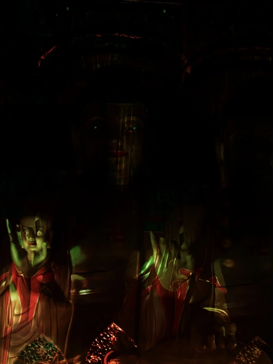 在无尽的黑暗中,我们的心灵编织着恐惧的网。那邪恶的佛与黑化的佛,投影出社会对神圣的误解与扭曲;那狞笑的蓝色恶魔,从神话与民俗的深处走来,成为超自然力量的化身。夜晚的鱼缸,在手电筒的光束中,化为怪物的面庞,那蓝色眼睛的怪物与女鬼般的怨灵,在黑暗中窥视着我们的灵魂。它们是陌生与异类的象征,是我们对未知与不可控力量的本能反应。 那仿佛有人葬的地方,墓地的寂静诉说着对死亡的永恒恐惧。而倒置的眼睛,承载着原生家庭创伤的隐痛,成为心灵深处无法释怀的伤痕。红色女鬼的面容在黑暗中闪烁,是强烈情感与失控的恐惧的象征。那可怕的屠夫鬼,在黑暗的角落里挥舞着血腥的刀刃,映照出我们对暴力与血腥的本能排斥。 在阴暗的绿光中,邪佛的身影愈发扭曲,它是我们对邪恶和腐败精神力量的恐惧,也是对自身道德与精神堕落的担忧。这些恐惧,源自成长的环境、文化的背景与内心深处的创伤,它们在潜意识中徘徊,如影随形。 然而,在这恐惧的深渊中,我们亦能找到光明的出口。正如黑暗中的点点星光,尽管微弱,却指引着我们前行的方向。这组作品以诗意的语言,描绘出人类无意识的深层次恐惧,唤起对内心的探索与理解。