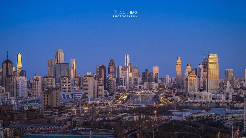 早上太阳刚刚升起,阳光照射到津城的高楼大厦形成金色反光,金色的暖色调与蓝调的天空,形成冷暖对比。