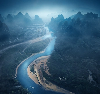 烟雨桂林,碧波漓江,晨雾轻纱绕山头