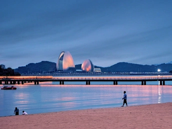 夕阳西下,海边的宁静与远处的日月贝相映成趣。生活的美好,在这一刻尽显无疑。
