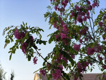 春日的街头,紫槐悄然盛放。一串串粉紫花朵垂挂枝头,如梦幻的风铃。在澄澈蓝天与暖光的映衬下,它用独有的温柔与烂漫,晕染出季节的诗意,每一片花瓣都似藏着关于春天的喃喃细语。