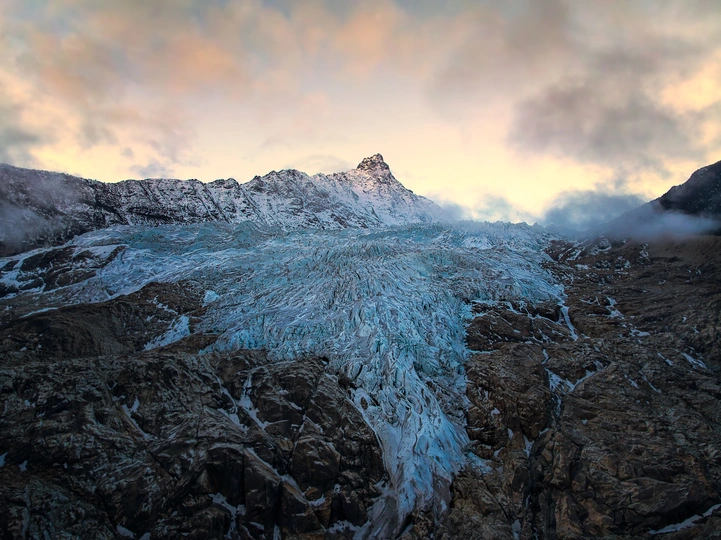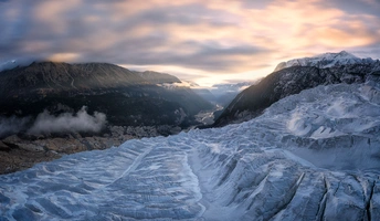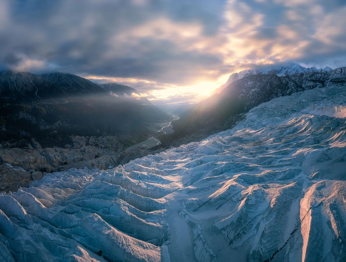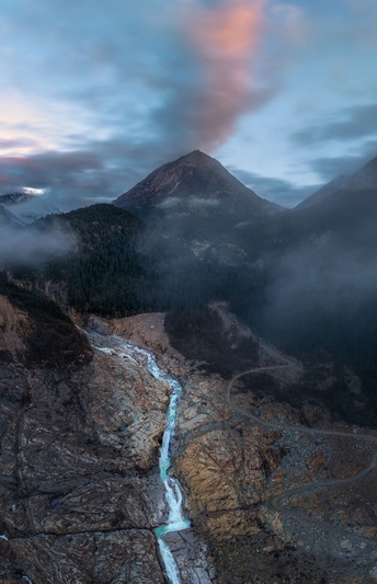 Awakening of the Ice Veins,冰川犹如大地的脉搏,在晨曦中缓缓苏醒,诉说着亿万年的沉默与力量。Like the earth's silent veins, the glacier stirs beneath the dawn light, whispering ancient strength through frozen time. First Breath of the Mountains,山峰静默,河流奔涌,在晨雾的轻纱中,天地仿佛刚刚睁开睡眼。The mountains stand still, the rivers rush below; through the misty veil, the world opens its eyes to a newborn dawn.