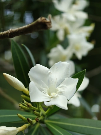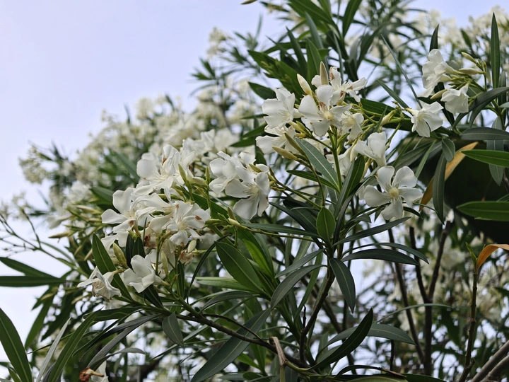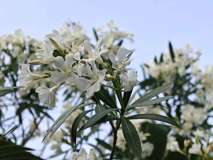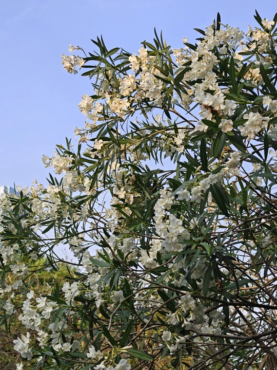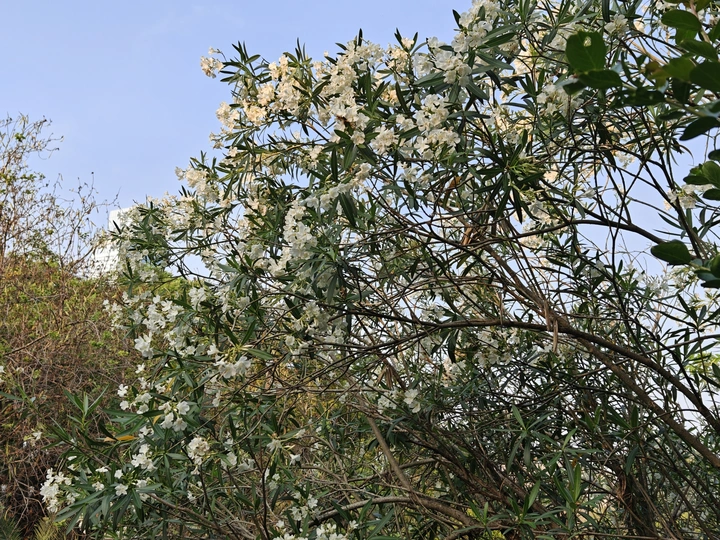 春日晴空下,夹竹桃肆意绽放。洁白花朵缀满枝头,如繁星洒落。在微风中,花叶轻轻摇曳,似在诉说着季节的温柔,于平凡角落,勾勒出独属于自然的浪漫诗行。