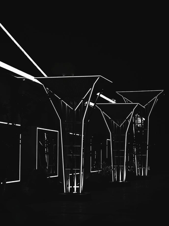 这张照片以黑白影调呈现,颇具“银翼杀手”般的赛博朋克韵味。光线成为灵魂,线条灯光巧妙勾勒建筑轮廓,现代感十足。构图简洁,主体突出且建筑排列富有节奏感。后期处理风格统一,强化了线条感。主题新颖,借建筑轮廓传递未来感,赛博朋克风易引发年轻人共鸣,传递出孤独冷漠的情绪,也反映出现代都市的快节奏与疏离感。