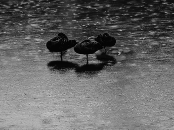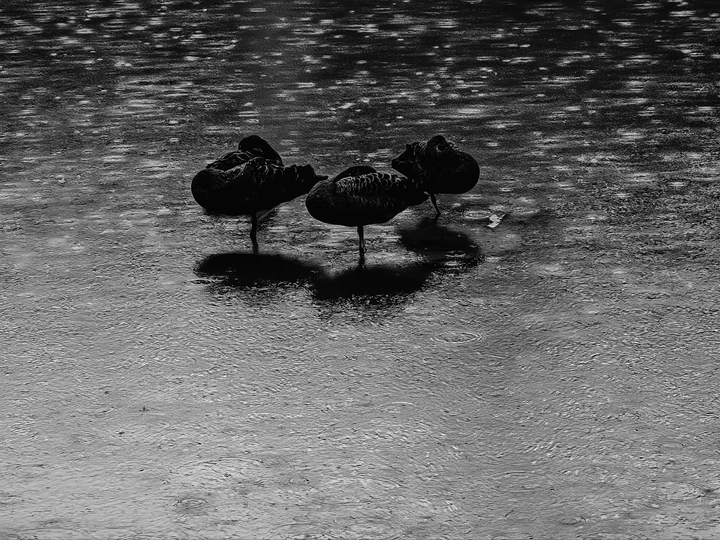 漫步湖边,恰逢细雨如丝。湖面上,几只黑天鹅宛如优雅的精灵,在雨中寻得一方宁静角落悠然憩息。 细密的雨丝轻洒,在水面晕开层层涟漪,却丝毫未扰黑天鹅的安宁。它们单腿伫立,身姿挺拔,乌黑发亮的羽毛在雨中更显深邃神秘,颈优雅弯曲,头部微微低垂,似在沉思,又似在享受这份独属于雨中的静谧。