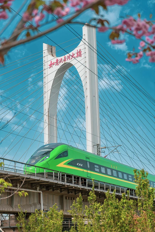 如意洸府河大桥矗立,线条简洁有力,一列绿皮列车正穿行其上。蓝天为幕,樱花点缀,将交通建筑的硬朗与自然柔美的景致相融合,展现出城市发展与自然景观的和谐共存。