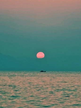 这个季节,从汕头东海岸观看日出,太阳是从海岛上升上来。