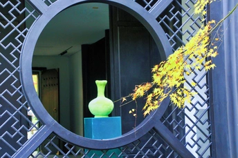 圆窗透景入画来, 青花瓷瓶映窗台。 秋枝斜倚添雅韵, 静谧时光细细裁。