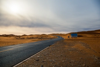 腾格里徒步,经过这里就到达太阳湖,路上车不多,由于是沙漠中的公路看起来十分绵长无尽头
