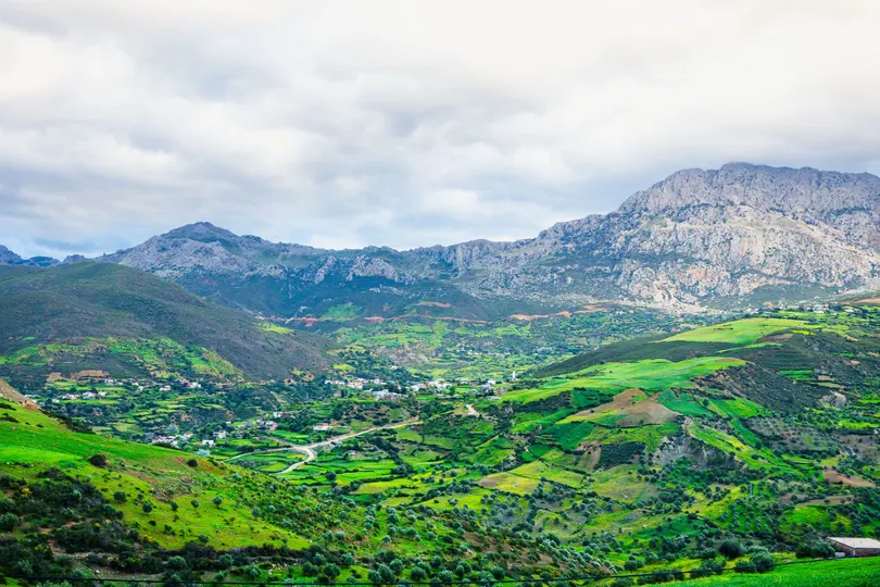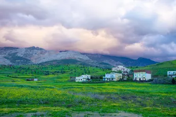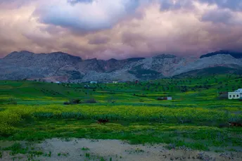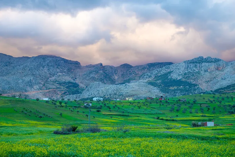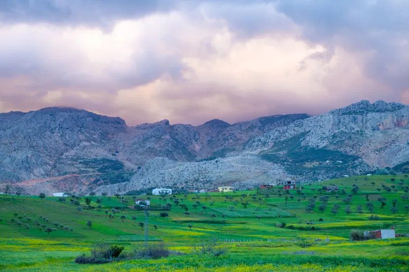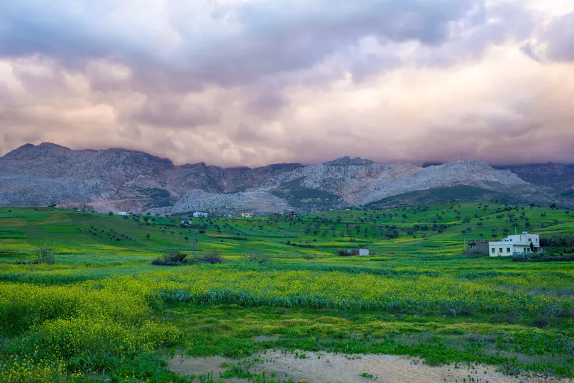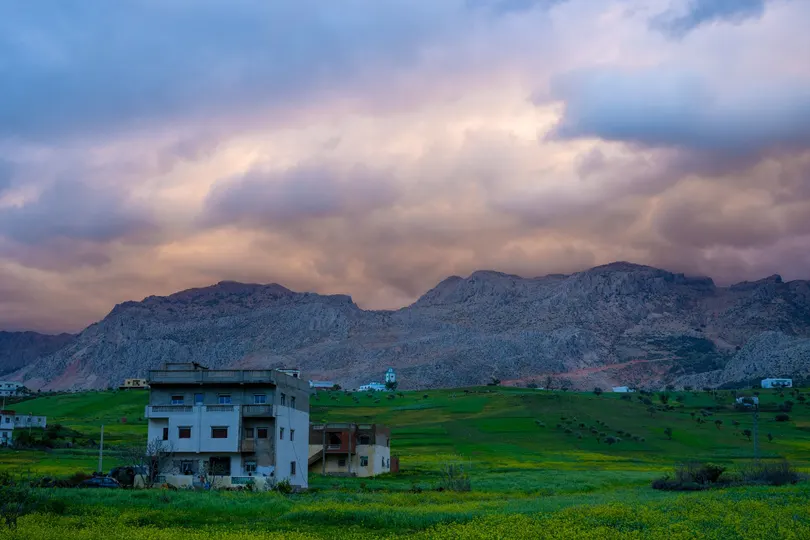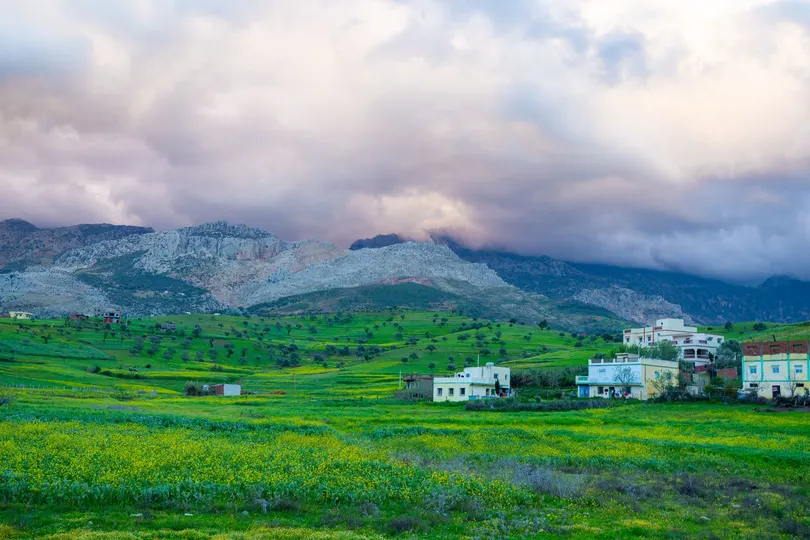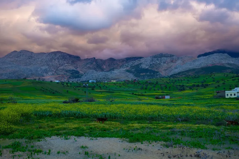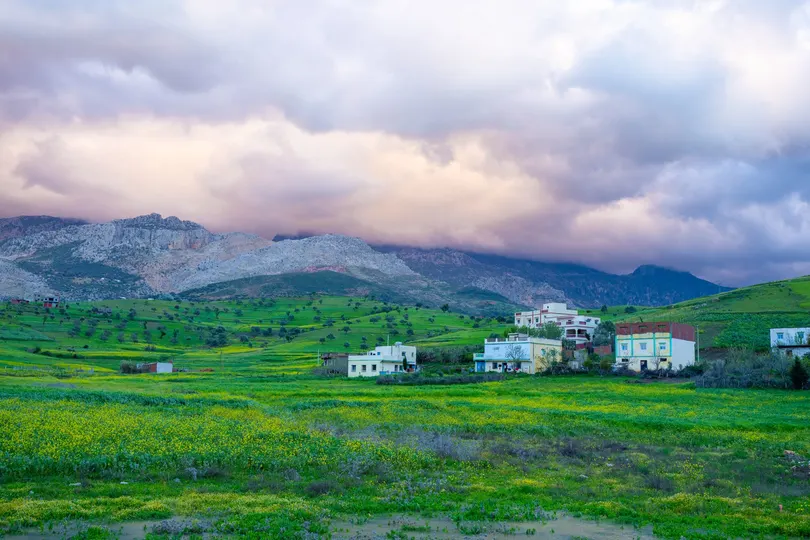 摩洛哥撒哈拉沙漠边缘的一片绿洲,棕榈树在微风中摇曳,泥砖房屋点缀其间,像是《千与千寻》里神隐之地的异世界。夜幕降临,星空如《天空之城》的浩瀚,点缀着流星,骆驼商队缓缓经过,带着一丝《风之谷》的冒险气息