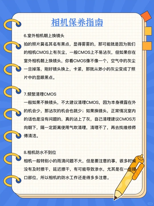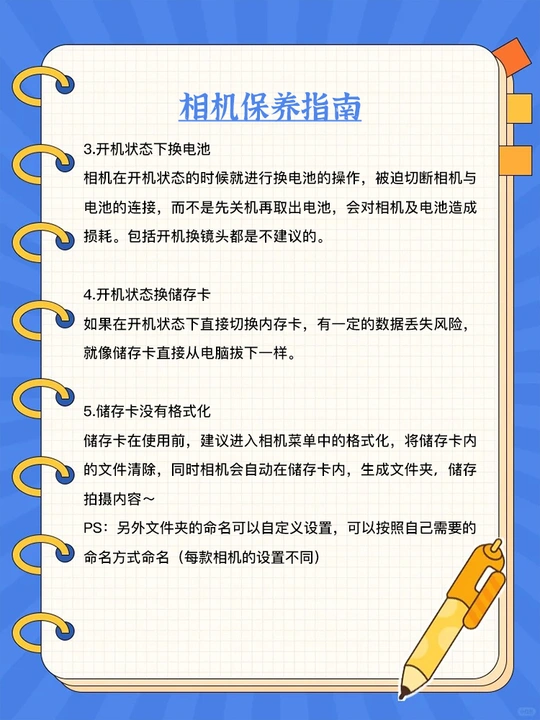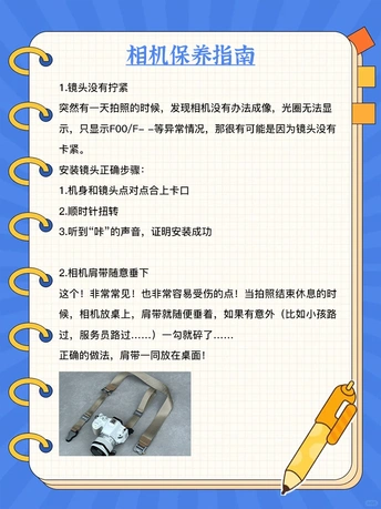 相机新手提前知‼️8⃣️条注意事项 使用相机,先提前了解相机使用的注意事项,让相机更长久的陪伴你记录生活点滴🌈 👇一起来看看吧~ 1⃣️镜头没有拧紧❌ 突然有一天拍照的时候,发现相机没有办法成像,光圈无法显示,只显示F00/F- -等异常情况,那很有可能是因为镜头没有卡紧❗️ ✅安装镜头正确步骤: 1.机身和镜头点对点合上卡口 2.顺时针扭转 3.听到“咔”的声音🔊,证明已安装成功~ 2⃣️相机肩带随意垂下🙅 这个!非常常见!也非常容易受伤的点!当拍照结束🔚休息的时候,相机放桌上,肩带就随便垂着,那么 如果有意外(比如小孩路过,服务员路过……)一勾就碎了💔…… 正确的做法,肩带一同放在桌面! 3⃣️开机状态下换电池🔋 相机在开机状态的时候就进行换电池的操作,被迫切断相机与电池的连接,而不是先关机再取出电池,会对相机及电池造成损耗。包括开机换镜头都是不建议的。 4⃣️开机状态换储存卡🈳️ 如果在开机状态下直接切换内存卡,有一定的数据丢失风险,就像储存卡直接从电脑拔下一样。 5⃣️储存卡没有格式化😡 储存卡在使用前,建议进入相机菜单中的格式化,将储存卡内的文件清除,同时相机会自动在储存卡内,生成文件