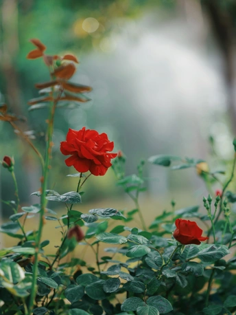 下午,偶遇公园的喷水设施 在光影里形成雾状光斑, 把月季映衬的越发清新脱俗。
