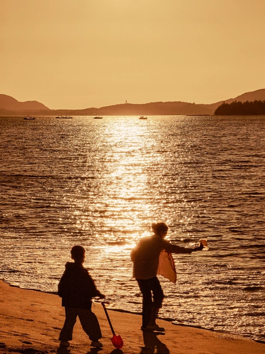太阳刚刚跃出海平面,金色的光芒洒向海滩和海面,一对母子正享受着这美好的晨光,一起玩着沙子。和煦的阳光洒在他们身上,镀上一层金色的光辉,空气中弥漫着浓浓的爱意。 shoot on 13ultra
