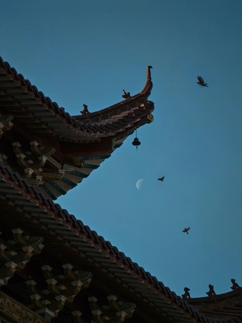 清晨月亮还在天边,文昌阁的燕子已经在忙着筑巢了