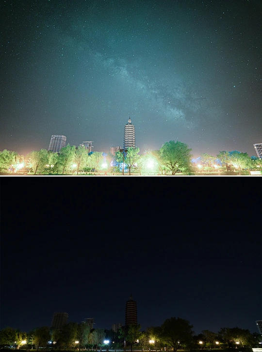 被光污染掩盖的美丽星空-燃灯塔2025年5月1日:拍摄于北京通州西海子公园。这是长期摄影项目“被光污染掩盖的美丽星空”,每次提供两张照片,一张模拟现场肉眼看到的图景,一张用特殊的拍摄方法展现星空。