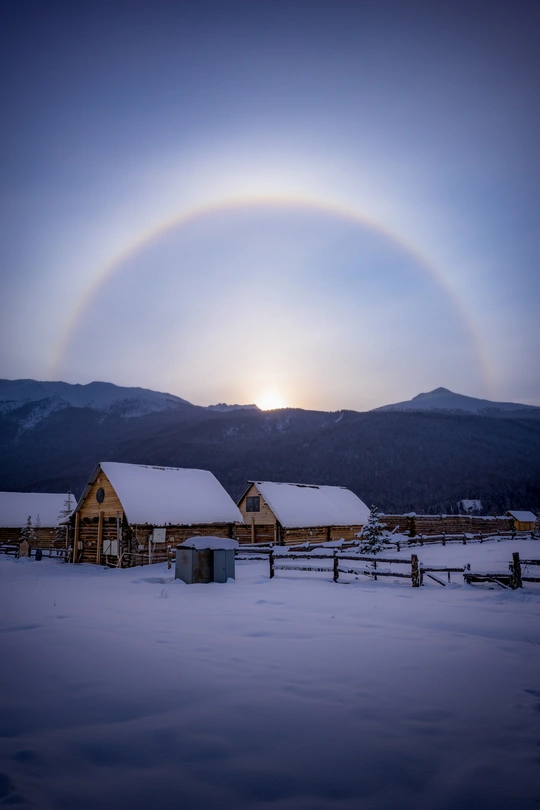 当蓝紫色的天幕垂落雪原,木屋的剪影与日晕交织成时空的秘语。炊烟在零下20℃的寂静中生长,每一片雪花都凝结着星辰坠落的轨迹——这里不是《冰雪奇缘》的片场,是雪乡用600年积雪写就的抒情诗。 拍摄设备:佳能r62+1535/2.8
