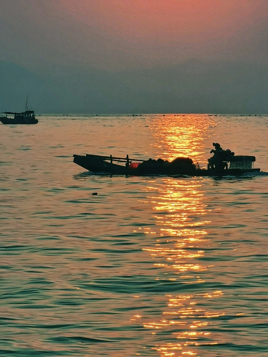 早晨,旭日东升金光洒海面。一渔船完成捕捞作业准备回归上岸。