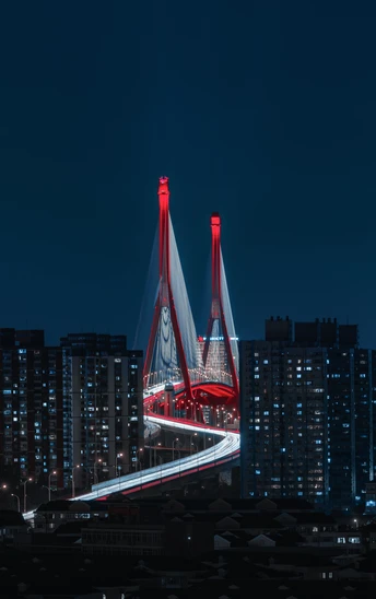 夜幕降临,红色的斜拉桥宛如夜的精灵闪耀着炽热的光芒。桥身的线条刚劲有力,与周围林立的高楼相互映衬,展现出都市的现代与雄浑。 桥上车轨,如灵动的音符,奏响着城市的夜之乐章,诉说着白天喧嚣之后的另一种繁华。高楼的窗户透出点点微光,恰似城市跳动的脉搏,藏着无数人的故事与梦想。 主体:杨浦大桥 拍摄地:上海浦东新区