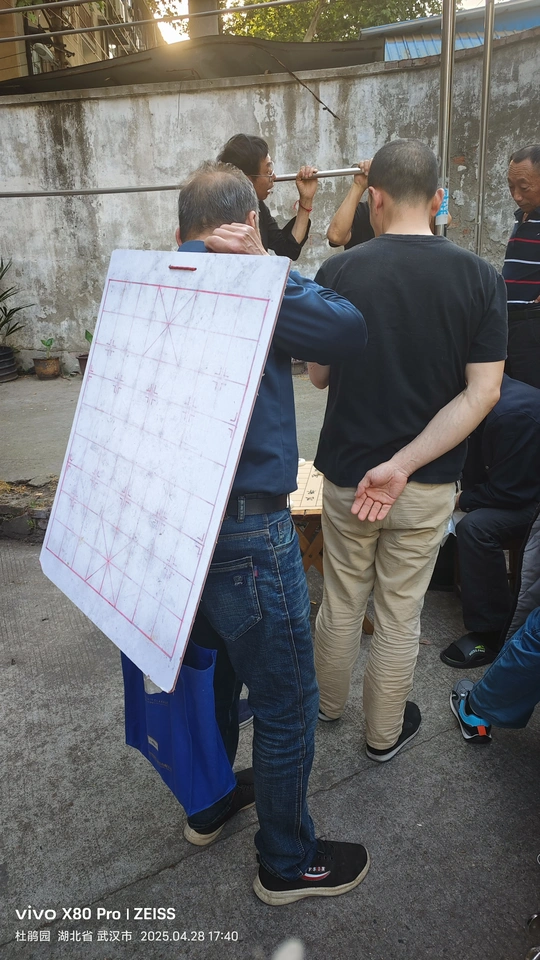 在老小区楼下这里有一群自发中国象棋爱好者。确很少看见有身背楚河汉界看棋。