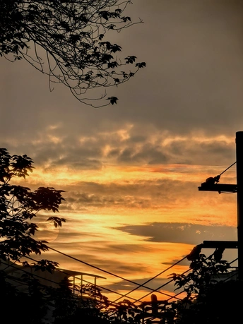 大雨过后,空气十分通透,正好碰上落日西下,金灿灿的阳光照射在彤云密布的天空,映射出满天彩霞,好一个迷人景象!