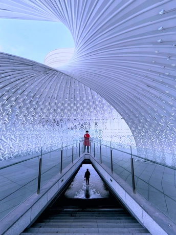 在这仿若未来之境的建筑中,线条如灵动的羽翼舒展。行人穿梭其间,似是踏入了时空的褶皱。光影洒落,编织出梦幻的网,每一处细节都诉说着建筑与艺术的交融,让人沉醉在这独特的美学世界里。