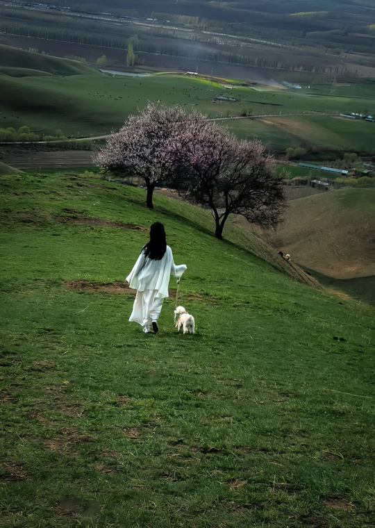 在那拉提杏花谷,拍摄了一位长发美女和狗狗朝山下走去的背影,氛围感和故事感拉满。