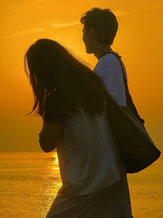旭日东升,照亮了大地。晨光下,一对情侣正下台阶去海边,刚刚遮挡到朝阳。